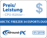 Der Arctic Freezer 34 eSports Duo ist ein rundum gelungener CPU-Kühler mit hoher Verarbeitungsgüte. Die Montage ist auf unserem X299-Testsystem problemlos und unkompliziert gelöst.Hinsichtlich der Kühlleistung müssen wir das Ergebnis mit einem lachenden u...