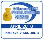 Intel hat mit der X25-V einen echten Preisbrecher ins Rennen geschickt. Die Performance kann sich durchaus sehen lassen, 180MB/s bis 225MB/s Lesegeschwindigkeit sind ein sehr guter Wert für eine SSD aus diesem Preissegment. Die Schreibgeschwindigkeit f...